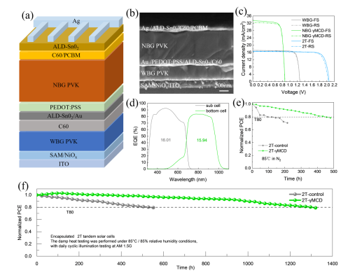 图1.a) 全PVK串联太阳能电池(TSC) 结构示意图。b) 全PVK TSC的横截面扫描电子显微镜(SEM) 图像。c) 添加了𝛾MCD的全PVK TSC的J-V曲线。d) 添加了𝛾MCD的全PVK TSC的EQE曲线。 对照器件和𝛾MCD改性器件在e) 充满氮气的手套箱中的85°C的存储稳定性。封装的对照器件和封装的𝛾MCD改性器件在f) 在85%相对湿度和85°C条件下的存储稳定性。