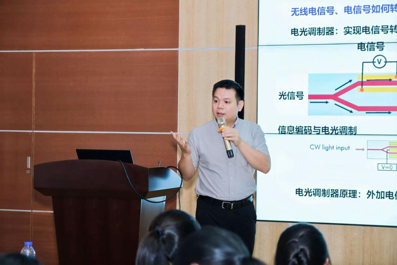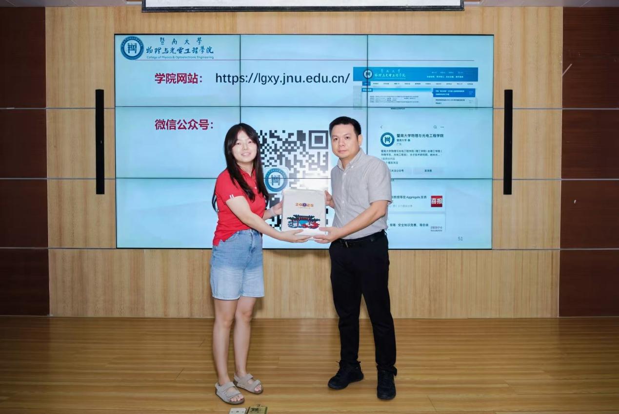 接下来,卢惠辉向同学们系统介绍了物理与光电工程学院(理工学院)的发展历程、专业特色与科研实力,并作题为“从简单光学现象到光电信息科学与工程”的科普讲座,引领学生认识光电信息科学与工程专业和学科的前沿知识和应用。同时,他结合院系在教学和科研方面的突出成果,鼓励同学们勇于探索、敢于创新,未来积极报考暨南大学。培正中学代表为卢惠辉赠送培正中学创意纪念品。