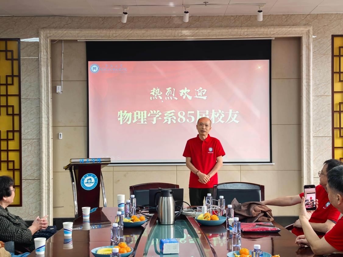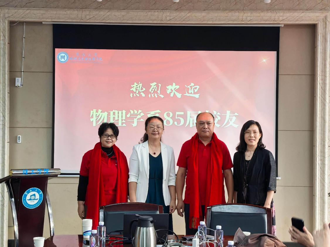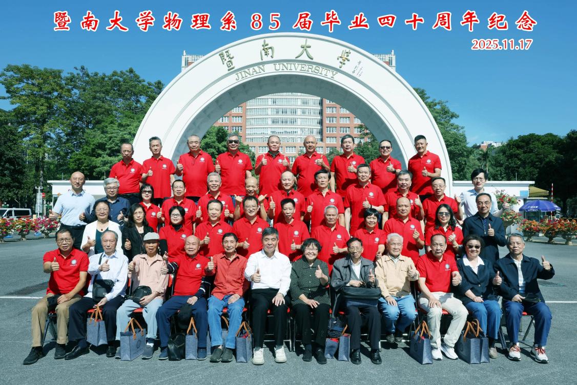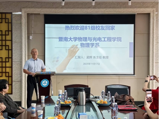 金秋时节,南国暨南园暖意融融。11月17日, 物理学系85届28位校友从加拿大、澳大利亚以及中国香港、中国澳门、北京、海南省、福建省等各地重返暨南园,以“思源”之名共叙师生情谊,以科技之光共绘发展蓝图。物理与光电工程学院党委副书记孙玉环、副院长麦文杰、物理学系党总支书记幸江涛、系主任孟辉,暨南大学原党委副书记、物理学系教授叶勤,原理工学院首任院长张永林教授,党委书记黄国淳教授等十二位退休领导老师一起参加交流。