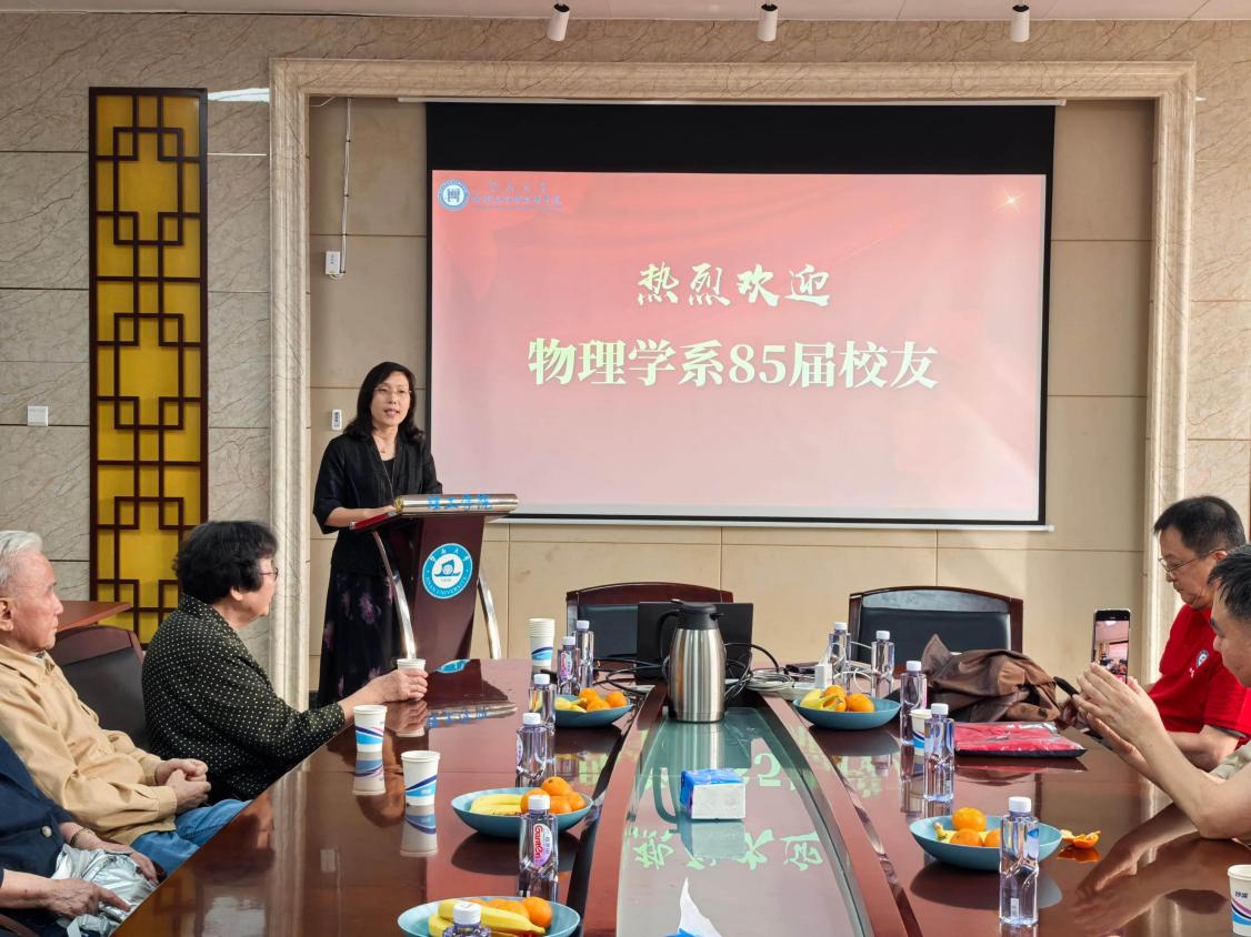 首先,孙玉环代表学院对海内外校友重返母校表示热烈欢迎,并指出恰逢学校正式启动迈向建校120周年盛典的倒计时一周年之际,能与各位校友在暨南园欢聚,倍感亲切与荣幸。她特别提到,2008年85届校友们怀着对母校的赤子之心积极捐资建立“物理学系思源实验室”。 这座实验室不仅是一个教学科研平台,更是一座连接过去与未来、承载情谊与希望的桥梁。它像一座灯塔,照亮了一批批物理学子探索科学奥秘的道路;它像一块基石,为物理学系的学科建设和人才培养提供了坚实的支撑。这份情谊,重如泰山;这份贡献,泽被后世。