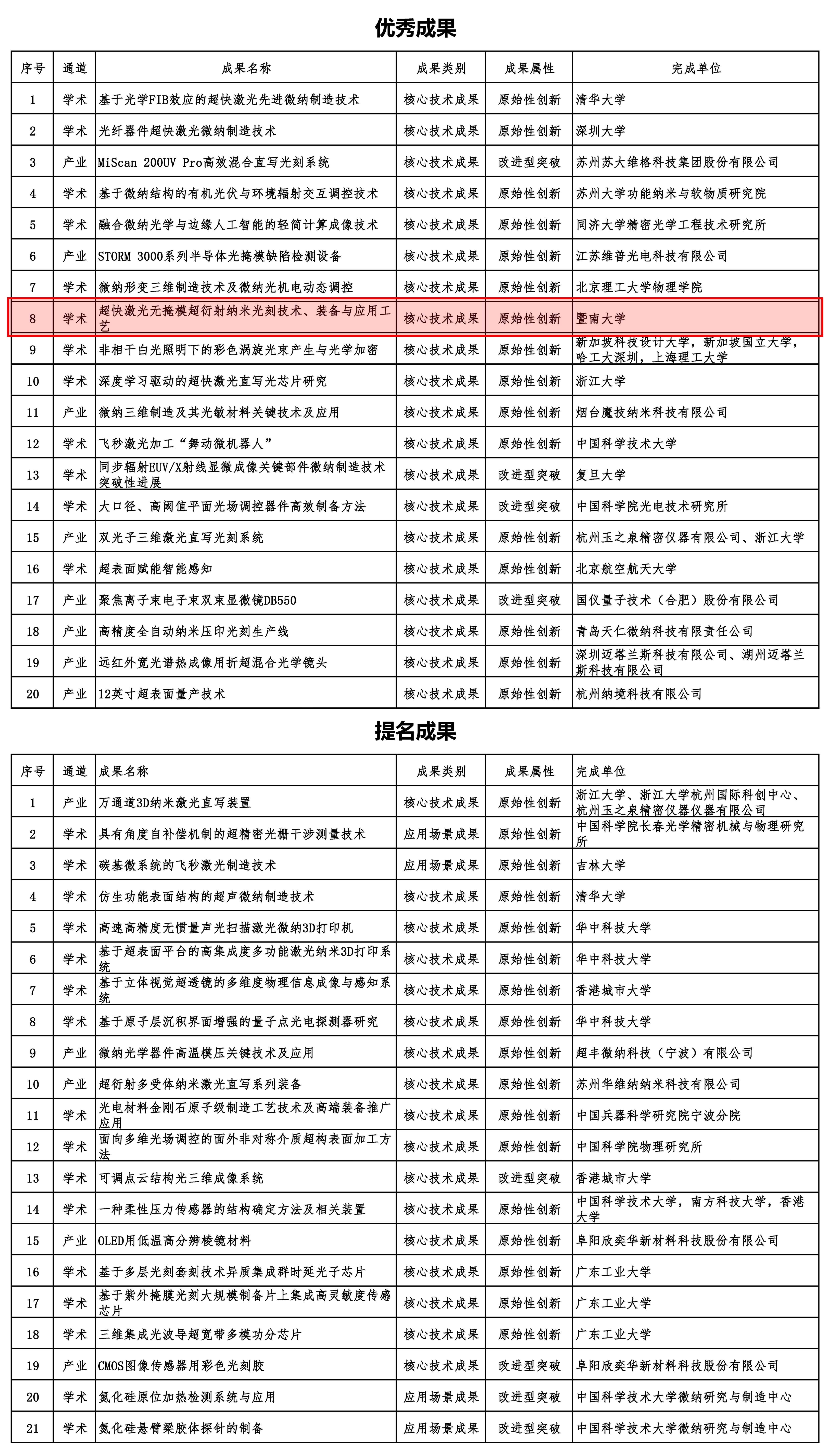 2025年11月13日至15日,中国光学工程学会公布了“2023-2025年微纳制造成果展”入选名单。物理与光电工程学院(理工学院)光子技术研究院段宣明教授带领的纳米光刻技术团队(段宣明、赵圆圆、梁紫鑫、陈经涛)联合中国科学院理化技术研究所(郑美玲、董贤子、金峰)研发的系列成果——超快激光无掩模超衍射纳米光刻技术、装备与应用工艺,被评为“优秀成果”,充分展现了团队在新原理纳米光刻领域的创新能力与技术突破。