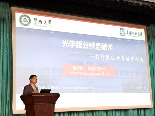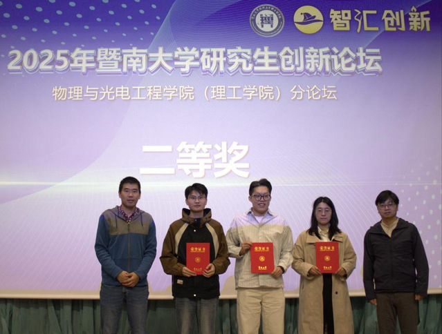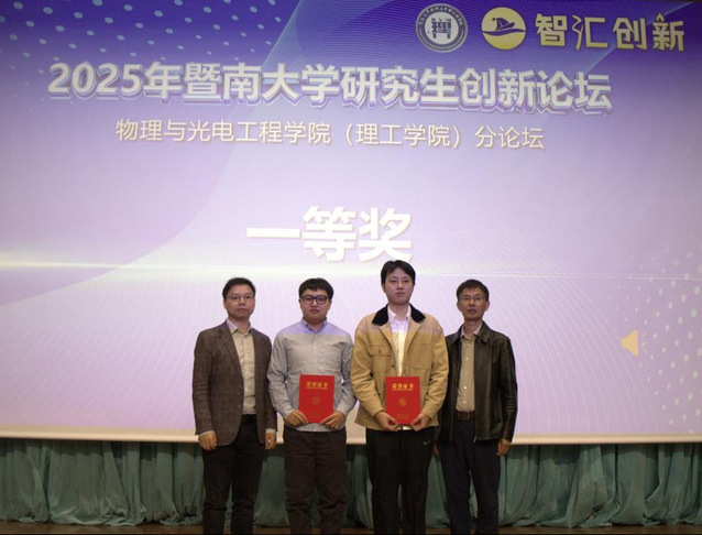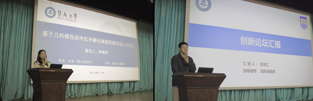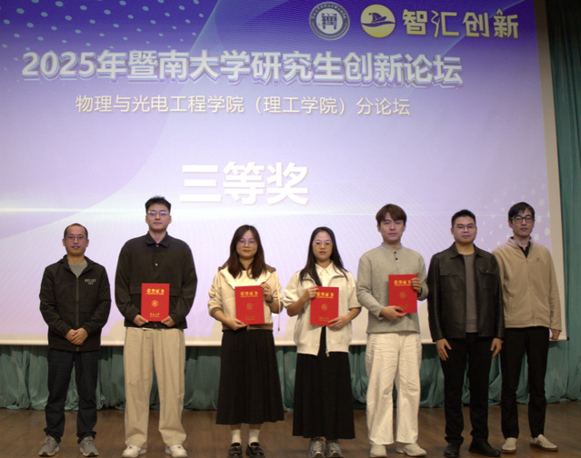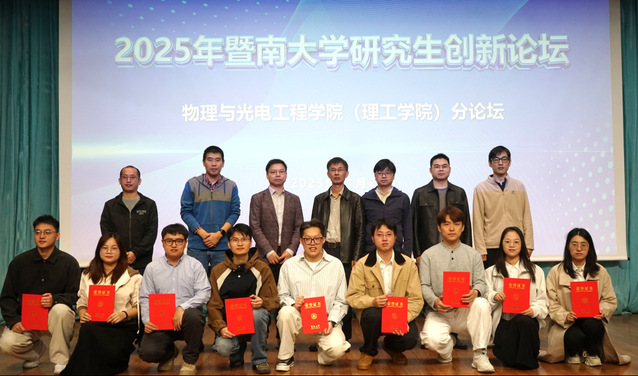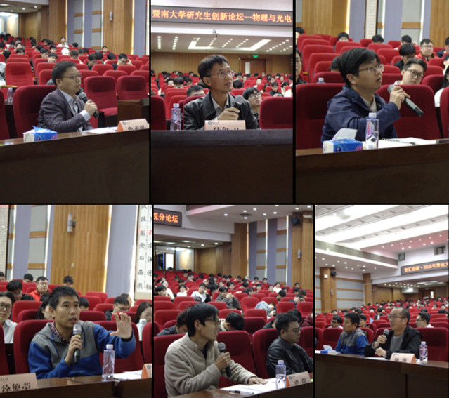 为搭建研究生学术交流平台,激发研究生学术热情和创新潜能,11月29日,我院在惠全楼报告厅举行“智汇创新·暨南大学研究生创新论坛——物理与光电工程学院分论坛”。分论坛特别邀请华南师范大学教授、国家杰出青年基金获得者詹求强作学术报告并担任点评嘉宾。物理学系副主任徐繁荣、光电工程系副主任代世波、光子技术研究院副院长冉洋、纳米光子学研究院史阳、新能源技术研究院钟海等担任评委。研究生院培养管理办公室主任柳向东、学院副院长狄红卫出席论坛并致辞,近300名研究生参加论坛。