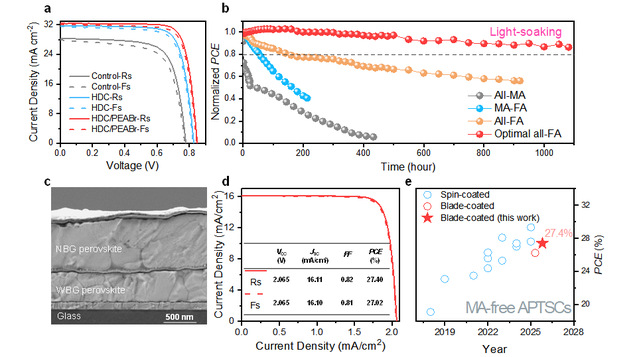 在此基础上,团队通过在钙钛矿前驱体中添加少量二氯化肼(HDC),使用刮涂工艺制备了高质量的甲脒基Pb-Sn钙钛矿薄膜。研究表明,HDC与Sn2+离子的选择性强配位作用不仅抑制了Sn2+的氧化,更重要的是,平衡了Sn基和Pb基物相的成核速率,从而显著提高了钙钛矿薄膜中Pb-Sn合金相的均匀性。所制备的单结全甲脒基Pb-Sn钙钛矿太阳能电池和无MA叠层器件分别实现了21.81%和27.40%的光电转换效率。此外,未封装的全甲脒基Pb-Sn器件在85℃下经受190小时的热应力后,仍能保持初始效率的80%以上。该研究得到国家自然科学基金(62174069, U21A20102, M-0515,62374053)等项目的资助。