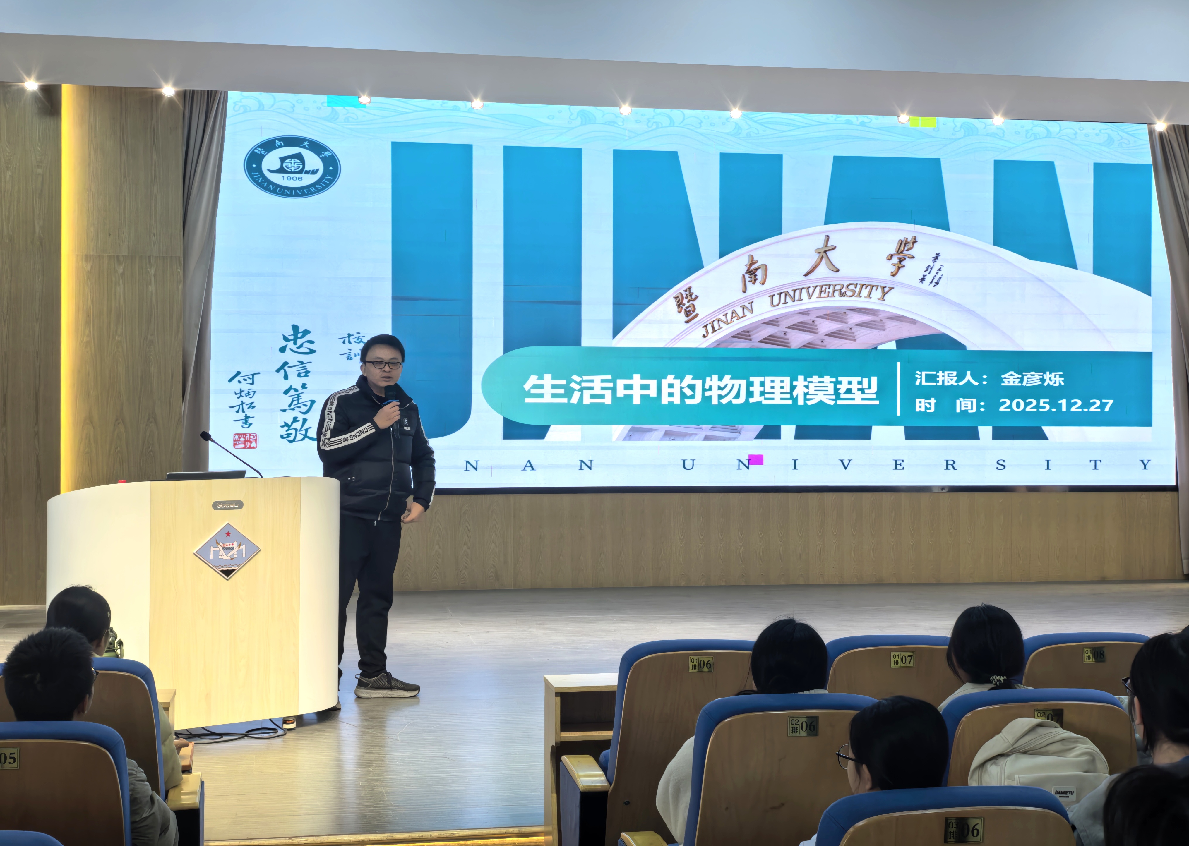 随后,金彦烁副教授作题为“生活中的物理模型”的趣味讲座。他将物理原理与日常现象巧妙连接,进一步激发了同学们探索物理世界的兴趣。他也自然融入对暨南大学的介绍:从深厚的历史底蕴,到多元化的人才培养模式与特色鲜明的专业设置与创新机制,再到丰富多彩的校园文化环境,他向同学们系统描绘了一幅全面而立体的大学图景,并鼓励大家未来积极报考,在暨南大学延续这份对科学的热爱与追求。