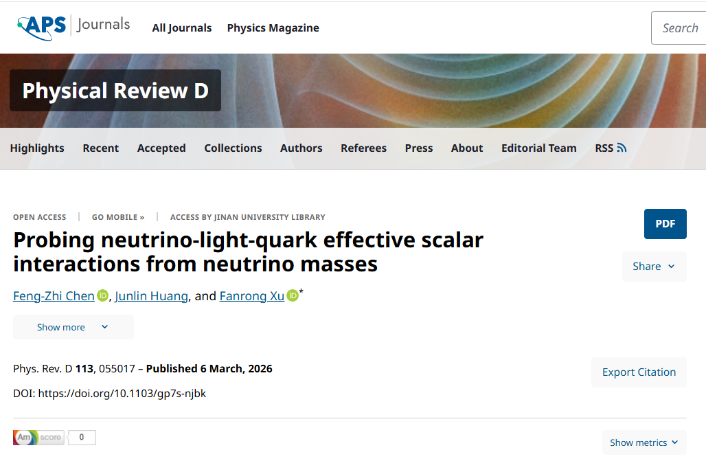 近日,物理与光电工程学院(理工学院)物理学系理论物理教研室重味物理团队在中微子物理研究领域取得重要进展。相关研究成果以“Probing neutrino-light-quark effective scalar interactions from neutrino masses”为题,发表于物理学权威期刊Physical Review D(Phys.Rev.D 113 (2026) 5, 055017)。该研究由陈丰之老师、研究生黄俊霖、徐繁荣教授共同合作完成。其中,陈丰之为论文的第一作者,徐繁荣为论文的通讯作者。